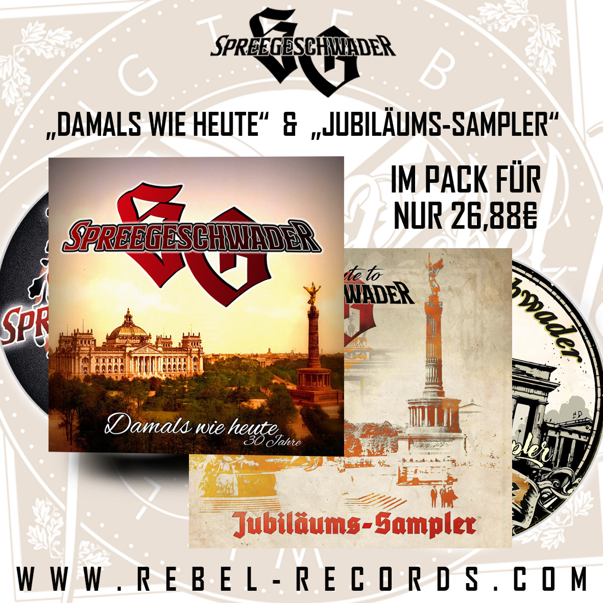 Und weil 30 Jahre Bandgeschichte nicht mal eben so gefeiert werden, gibt’s noch eine ganz besondere Geburtstags-CD obendrauf: die „Jubiläums-CD“, exklusiv eingespielt von befreundeten Künstlern. Jede Band covert dabei einen Spreegeschwader-Song auf ihre eigene Art. Mit dabei sind unter anderem: Kopfschuss, Hausmannsost, SPN/S, Symphonie des Blutes, Deutsch-Stolz-Treue, Legion of Thor, Blutrein, Aufbruch, Helle & die Rac’ker, Heureka, Stimme der Vergeltung, das Landwehrkanal Kollektiv mit einem Gemeinschaftslied und zum Schluss das Panzerbär Orchester mit einem rockigen Ausklang.